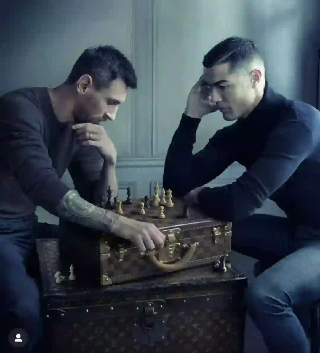例如LV的这张海报,梅西和C罗上演了难得一见的“世纪同框”,在世界杯开始之前赚足了声量。
