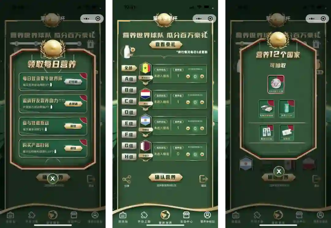 例如蒙牛的小程序就设置了世界杯相关的游戏活动。用户可以通过完成任务获取「营养值」,培养自己喜爱的球队,达到对应数量可以抽取奖品,包括优惠券、牛奶、官方足球、签名球衣等。