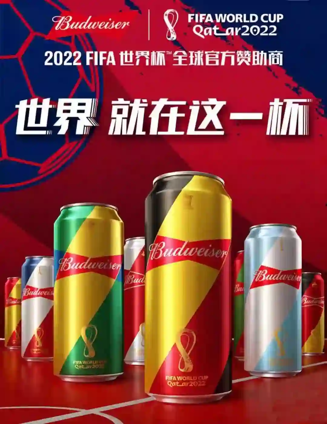 例如百威作为世界杯全球官方赞助商推出世界罐和世界瓶包装,瓶身以八个球队颜色为主题,让人一目了然,加强了世界杯元素属性。