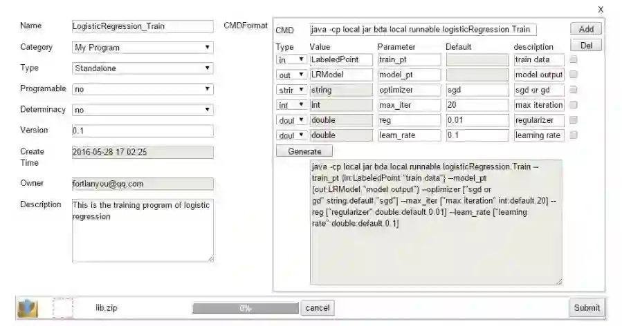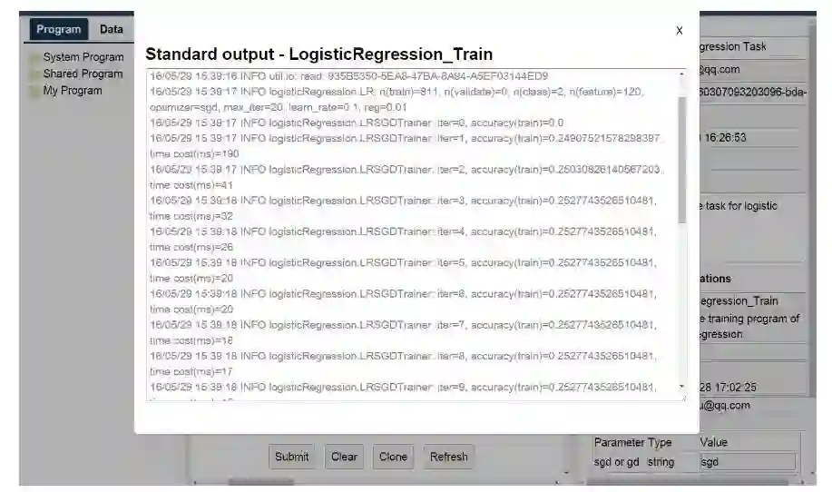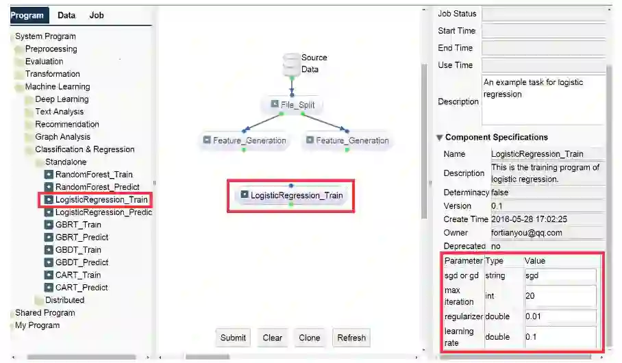 我们的平台 Easy Machine Learning 提供了一个通用的数据流系统,可以降低将机器学习算法应用于实际任务的难度。在该系统中,一个学习任务被构造为一个有向非循环图(DAG/directed acyclic graph),其中每个节点表征一步操作(即机器学习算法),每一条边表征从一个节点到后一个即节点的数据流。任务可被人工定义,或根据现有任务/模板进行克隆。在把任务提交到云端之后,每个节点将根据 DAG 自动执行。图形用户界面被实现,从而可使用户以拖拉的方式创建、配置、提交和监督一项任务。该系统的优点有: