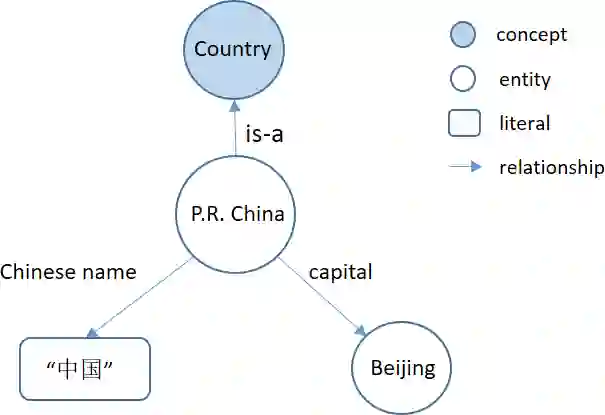知识图谱已成为人工智能、数据库和语义Web领域的一个热门术语,它是指以图形式表示的任何知识集合,如语义Web知识库(如DBpedia[1]和Yago[2])、RDF数据集和形式本体。图结构中的节点可以是概念、实体和文字,边是不同类型的关系。如图2所示,实体代表现实世界的个人(例如,“P.R.中国”和“北京”)。概念代表了一组具有相同特征的个体,如“中国”、“希腊”、“美国”等,构成了一套与“国家”概念相对应的概念。文字是指表示某些关系的特定值的字符串,如字符串“中国”,实体“P.R.China”的中文名称。这些节点之间的边代表着实体、概念和文字之间的不同关系,如“中华人民共和国”是一个“国家”,“中国”的首都是“北京”。所有这些关系及其相关实体、概念或文字都以知识图谱的三元形式存储,知识图谱是知识图谱的基本存储单元。三元组以<主语、谓语、宾语>的形式组织知识,例如<P.R.中国、is-a、Country>和<P.R.中国,中文名称“中国”>