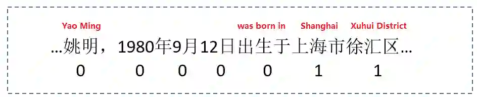 Xu等人提出了一种混合的长短时记忆递归神经网络框架从自由文本中提取知识,可以使用这种方法在CN-DBpedia对消息盒的进行补全任务。CN-DBpedia将消息盒补全任务视为从与给定实体对应的文章中提取给定对主语和谓语的对象。该方法将提取问题建模为一个seq2seq的学习问题。输入是一个包含令牌的句子,输出是每个令牌的标签。标签是要么为1,要么为0,预测令牌是否为谓词对象的一部分。例如,图9中的句子取自与百度百科中的实体“Yao Ming”对应的文章。“出生地”的提取者将把“上海”和“徐汇区”标注为“姚明”的真实名称。为了缓解人力的负担,这种方法也采用了远程自动监督的方法构造训练数据。它可以构造能够表达消息盒中的事实句子作为训练数据。例如,如果< Yao Ming, Height, 2.29 m >出现在姚明的消息盒中,则该方法将造句“姚明的身高是2.29米”,并在句子中正确地标注宾语。为了涵盖尽可能多的有用信息,这种方法训练了单词的混合表示,输入令牌序列中每个令牌的短语和类型。然而,训练是长期的短期的记忆递归神经网络模型由于需要大量的参数,需要更高的时间复杂度来估计。