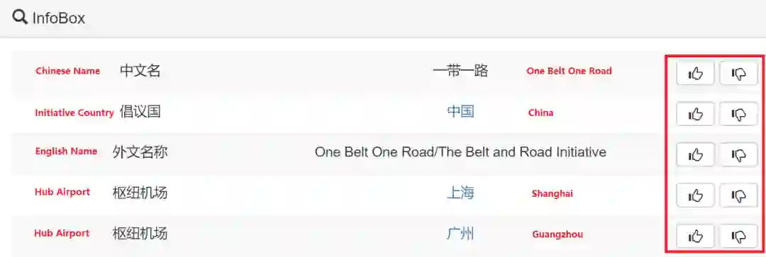Xu等人提出了两种错误检测方法,并将其应用于CN-DBpedia中。第一个是基于规则的错误检测。该方法使用许多预定义的规则来检测违反规则的错误。例如,它使用属性的域和范围来查找错误。比如属性“生日”的范围应该是时间,任何其他类型的值都是不正确的。第二个方法基于用户反馈。CN-DBpedia提供了一个用户搜索界面来浏览的知识。该接口允许用户提供关于CN-DBpedia事实的正确性的反馈(参见图10)。