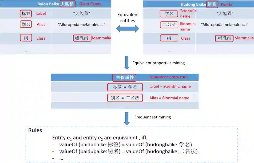 在该方法中,利用owl:sameAs关系链接的少量现有等价实体及其属性作为种子,挖掘更多等价实体。对于每一对存在的等价实体,该方法首先尝试从它们中挖掘等价属性。然后,通过关联规则挖掘从这些等价属性中挖掘出频次集,每个频次集由若干对等价属性组成。挖掘出的频次等价属性集用于构建匹配规则,并应用于整个数据集以发现新的等价实体。例如,在图7中,百度百科中的属性“标签(Label)”等同于互动百科的属性“学名(Scientific name)”,和百度百科的“别名(Alias)”相当于互动百科的“二名法(Binomial Name)”。如果等价属性集合(如上述的等价属性对)是一个频次的集合,这意味着它也可以从许多其他等价中挖掘出来实体,则将用于构造匹配规则。图7也给出了匹配规则的一个例子,当且仅当频次集中对应的等价属性的值都相等时,实体e1和e2才是等价的。