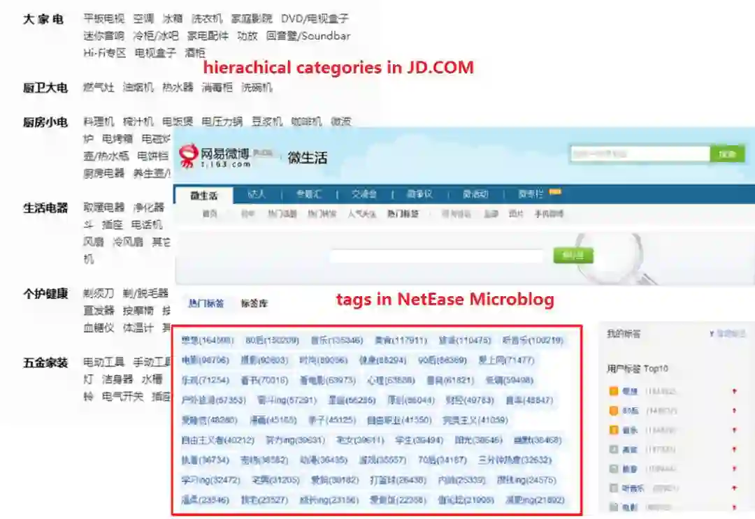 现有的中文知识图谱,包括Zhishi.me、CN-DBpedia、XLORE等,都是从结构化或半结构化数据中提取知识的。以Zhishi.me为例,以百度百科全书、互动百科全书和中文维基百科三大中文百科全书为数据源,从中提取了大量的知识。如图5所示,Zhishi.me从这三个在线百科全书的文章中的结构化数据(例如消息盒)和半结构化数据(例如标签、摘要、类别和重定向)中提取实体及其相关知识,我们还列出了用于表示知识的一些生成的RDF三元组。除了Zhishi.me,CN-DBpedia和XLORE都采用类似的方式从在线百科全书中提取知识。Linked Open Schema提取层次化类别和社会标签半结构化数据)作为模式级知识挖掘的来源(如图6所示),即挖掘类别和标签之间的语义关系。