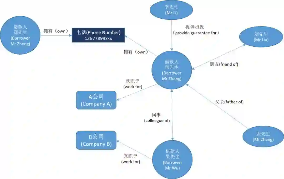 知识图谱可以表示和链接多种类型的数据,如文本、多媒体、传感器等,在不同类型的大数据之间建立关联。这种关联的大数据可以很容易地用于信息分析和辅助决策。知识图谱在智能分析中起着非常重要的作用。如图13所示,在反欺诈情报分析的场景中,我们可以通过融合来自不同数据源的信息,添加领域专家建立的业务规则来构建一个情报知识图谱。通过知识图谱中的数据不一致性检测,可以识别潜在的欺诈风险。例如,借款人张先生和借款人吴先生在填写个人信息时声称是同事,但填写的公司名称不同。此外,张先生的电话号码也是另一位借款人甄先生的。这些不一致表明存在潜在的欺诈行为,因此银行将分别拒绝张先生、吴先生和郑先生的贷款请求。此外,知识图谱已经应用于许多其他类型的情报分析,如警察情报分析、库存情报分析等,以辅助决策。