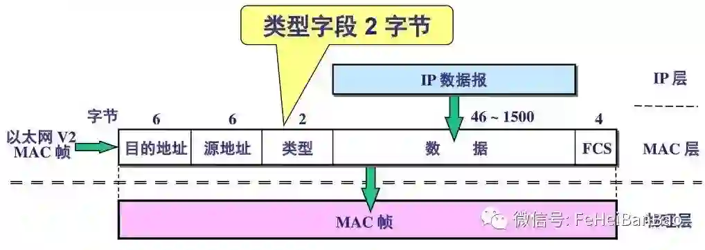 类型字段采用 16 位二进制表示更上一层的网络层数据包的类型:IP、ARP、ICMP 等。