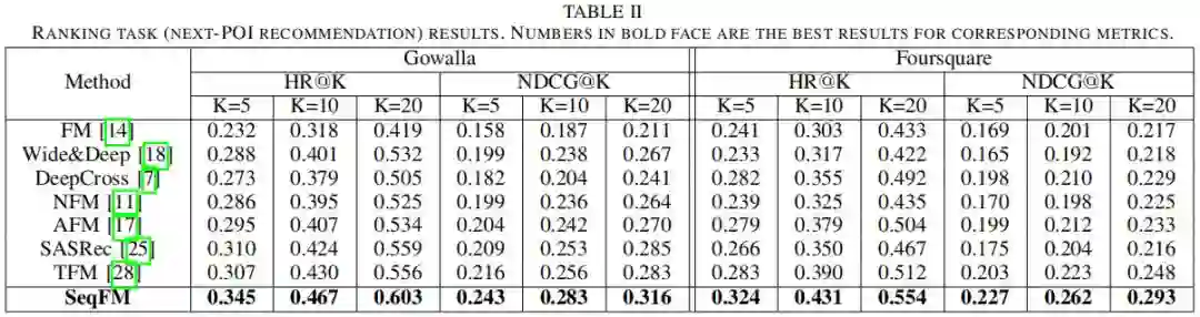 作者在不同的任务和不同的数据集上均进行了大量实验,验证了本文提出的 SeqFM 的有效性,也验证了本文提出的 SeqFM 在处理动态序列特征时相比于传统的基于 FM 的方法简单的将所有动态特征作为普通无序集合特征处理对于时序预测分析更有帮助。