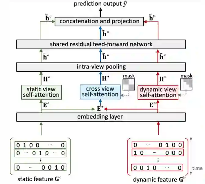cross view self-attention mask 屏蔽了相同类别特征内部的特征交互,只允许跨类别的特征交互 ( 静态特征和动态特征之间 )。