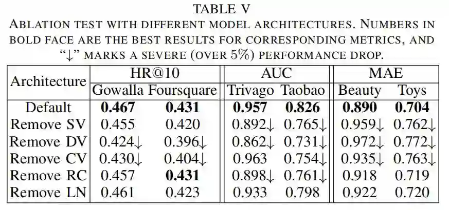 去掉 Dynamic View 后在分类任务中有非常严重的指标下跌 Trivago ( 10% )和 Taobao ( 12% )。作者给出的解释是这些数据集中包含大量的点击行为日志,这些动态特征序列携带着每个用户的长期偏好信息。