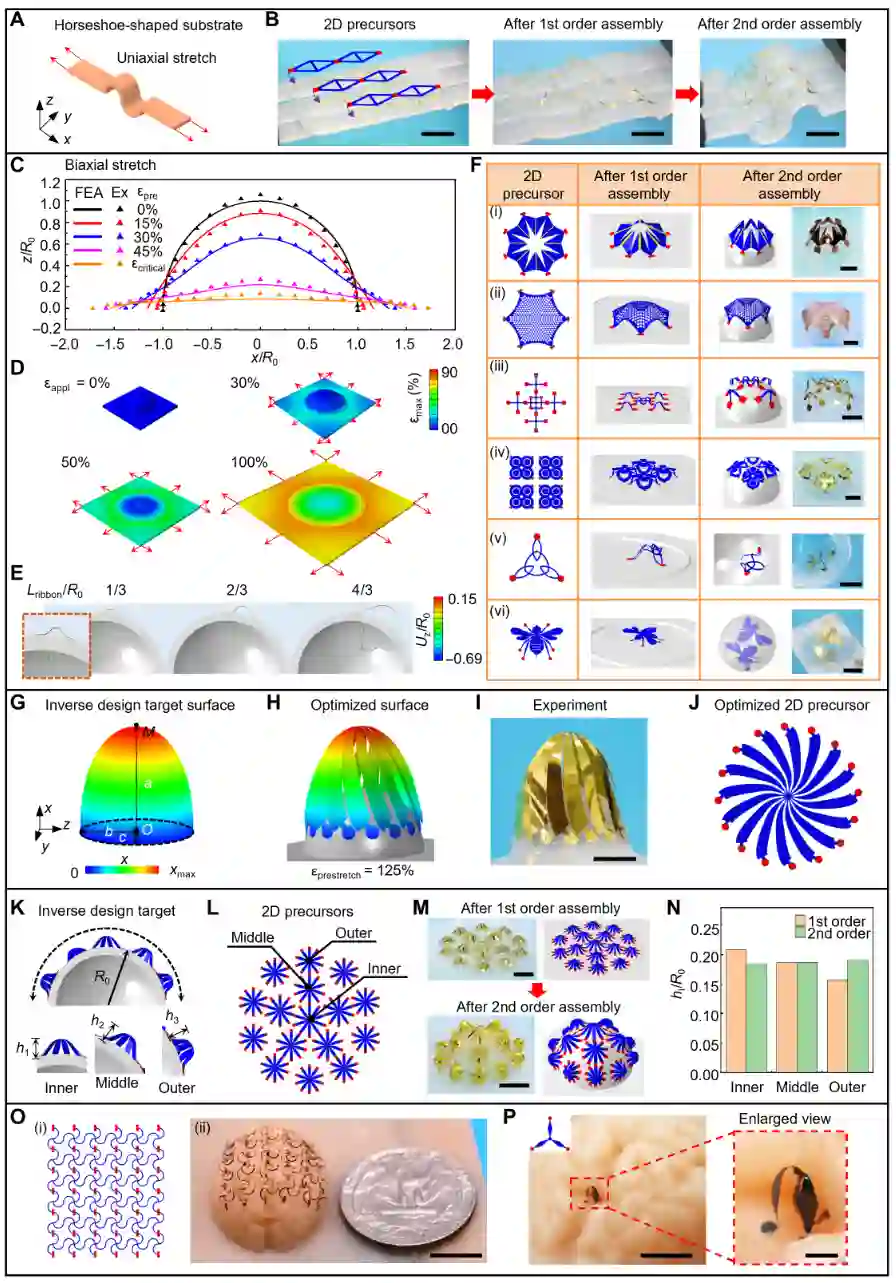 G到J:装配在半球形基底上的半椭圆形表面的逆向设计。(K到N)在半球形基底上不同空间位置组装的具有相同高度(hi)的小半球形的逆向设计。(O和P) 组装在类脑表面的螺旋形微尺度结构网络和微小的三维斜方体带状微尺度结构的光学图像。