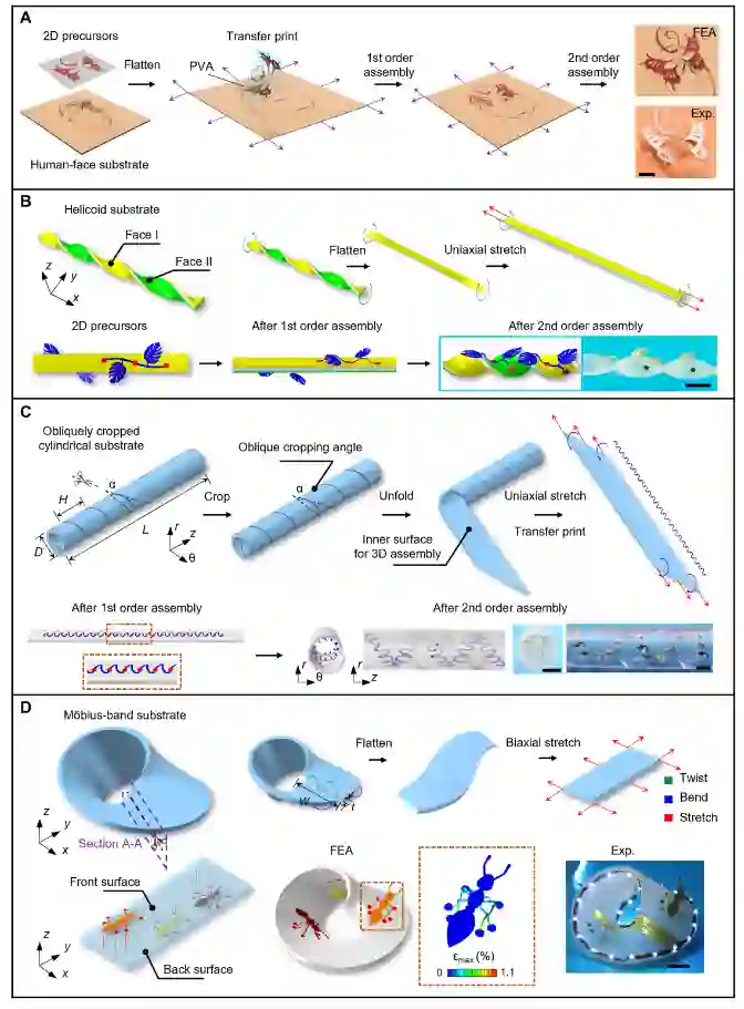 本研究介绍了一种有序的组装策略,可以在不同的弯曲表面上将二维薄膜转化为复杂的三维结构。该策略利用预定机械负载,使弯曲的弹性体基底变形为平面/圆柱形结构,然后通过额外的单轴/双轴预拉伸来驱动扣弦引导的组装。