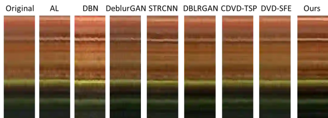 图3. TSR-WGAN(最后一列)与其他对比方法校正抖动与几何畸变效果对比