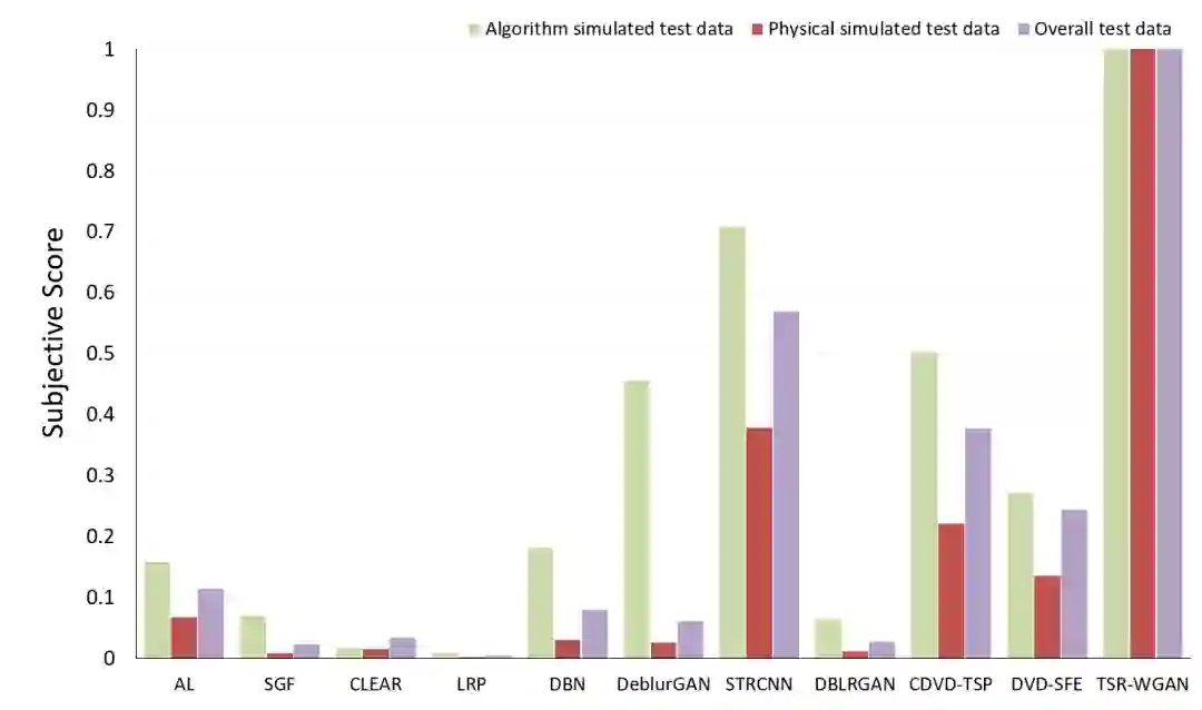 针对上述问题,白相志教授团队基于大气湍流效应成像退化机制进行半物理仿真,提出一种基于生成对抗网络的逆向推理方法(TSR-WGAN),抑制了光线波动引起的模糊效应(图2),缓解了光路变化导致的时域连续几何畸变与抖动(图3)。在PSNR、RRED等客观量化指标上均优于对比方法,在包含50名参与者的主观测试中总体得分指标领先对比方法50%以上(图4)。更为重要的是,该研究建立了大型仿真湍流数据集和真实湍流数据集(共27458段视频序列,包含411870帧图像),提供了视觉对比评测软件。研究成果可为后续湍流物理性质的探索提供理论支撑,在高分对地观测、远距离成像探测、大范围安防监测中有重要应用。