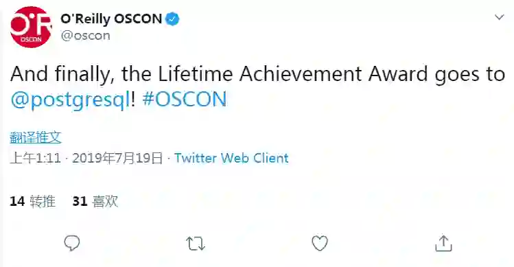 在近日举办的 OSCON(The O'Reilly Open Source Convention) 开源软件会议上,O'Reilly 宣布 PostgreSQL 荣获 2019 年 O'Reilly 终身成就奖。