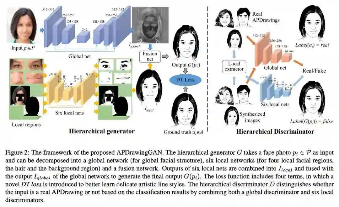 为了有效地学习不同面部区域的不同绘图风格,GAN 架构涉及专门用于面部特征区域的几个局部网络,以及用于捕获整体特征的全局网络。为了进一步应对艺术家绘画中基于线条笔划的风格和不精确定位的元素,还提出了一种新的距离变换(DT)损失来学习 APDrawings 中的笔划线。