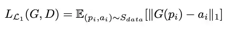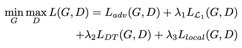 整个模型的损失函数由四部分组成,大家熟知的生成对抗损失、像素层面损失、距离变换损失以及局部像素损失。对于生成对抗损失,主要分为两部分一个是全局性的生成对抗损失和局部性六个部位的生成对抗损失;像素层面损失主要是采用 L1 损失: