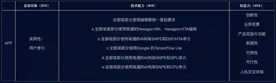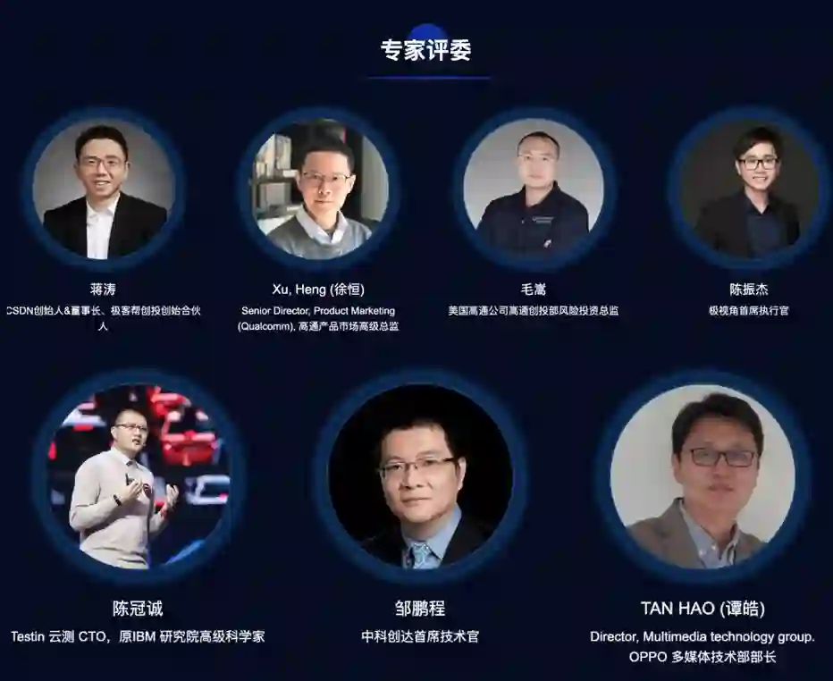 大赛发起人 Qualcomm 将联合CSDN、Testin云测、极视角、中科创达、OPPO、TensorFlow Lite 和创业邦的行业专家组建【评选组委会】,两轮参赛作品都将由【评选组委会】进行打分与评判。