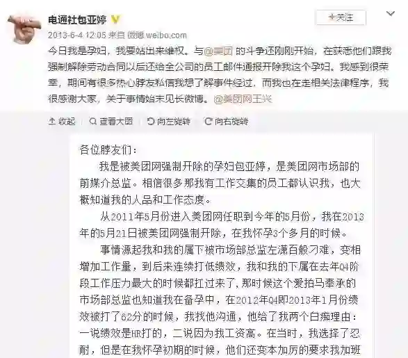 她因为孕期被裁员时,出身阿里的时任美团COO干嘉伟曾用“阿里巴巴员工体系风格”与之沟通,说“你累了可以回家休息,薪水照旧”。后来事情闹到媒体上,美团发出开除通知单后,美团高级副总裁王慧文亦曾表示“可以调解”。