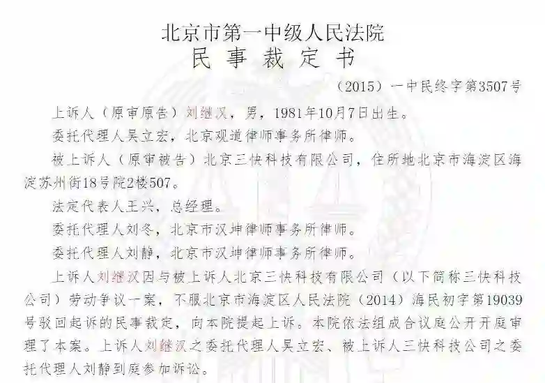2014年开始,他先是向法院提起股权诉讼,但法院以“属于劳动争议”未受理,建议仲裁。但劳动仲裁机构以不属于受理范围为由而作出不予受理的决定。刘继汉再以劳动争议将美团运营主体北京三快科技有限公司(下称三快公司)诉之法院,这次开庭审理,但法院认为一审认为,授予期权的是美团公司,而非劳动合同的签署主体三快公司,裁定驳回。