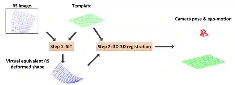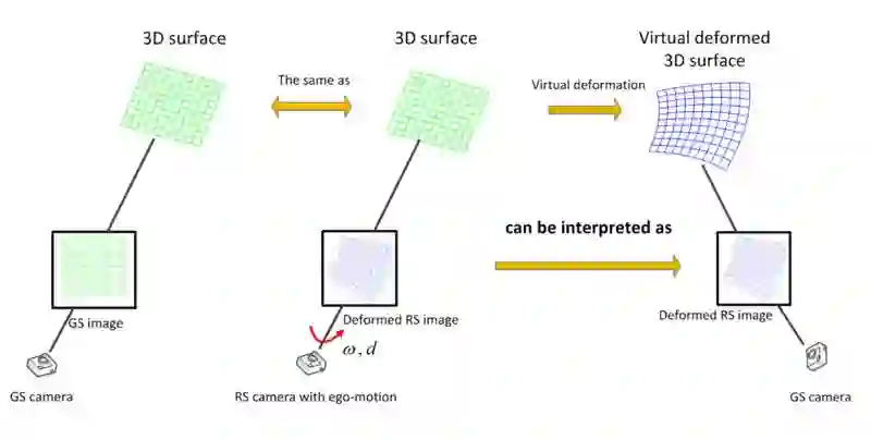 刚体的 3D template 在 RS 相机中的形变,可以被看作一个非刚体可形变的 3D template 被 GS 相机所捕捉。从而将 2D 照片中的形变等效到了 3D 空间中,进而使用 Shape-from-Template 技术实时重建这个一直处于形变中的虚拟 3D template,最后使用已知的 template 和每一帧重建的形变 template 做 3d-3d 注册,从而求解出了 RS 相机的姿态和瞬时自运动参数。