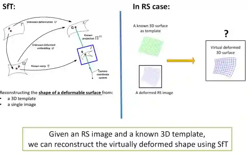 好,回到 RS 的问题上来,大家有没有发现 SfT 和上述思想实验的共同点:都有一个 3D template 当 reference,然后每一张照片都对应了一个 template 的形变。因此,我们可以用 3D template 和 RS image 去重建这个 Virtual Deformed Template。
