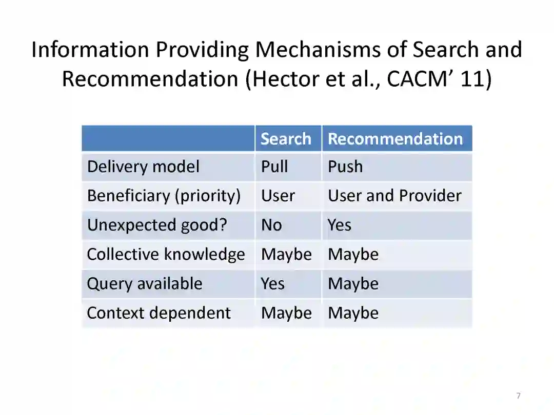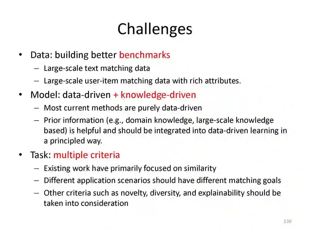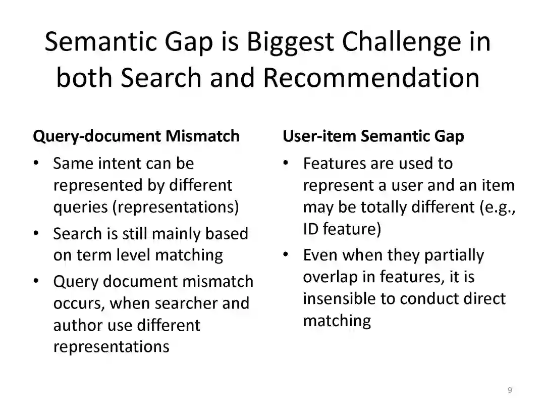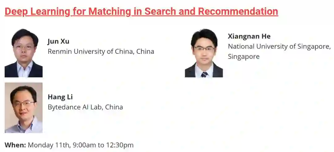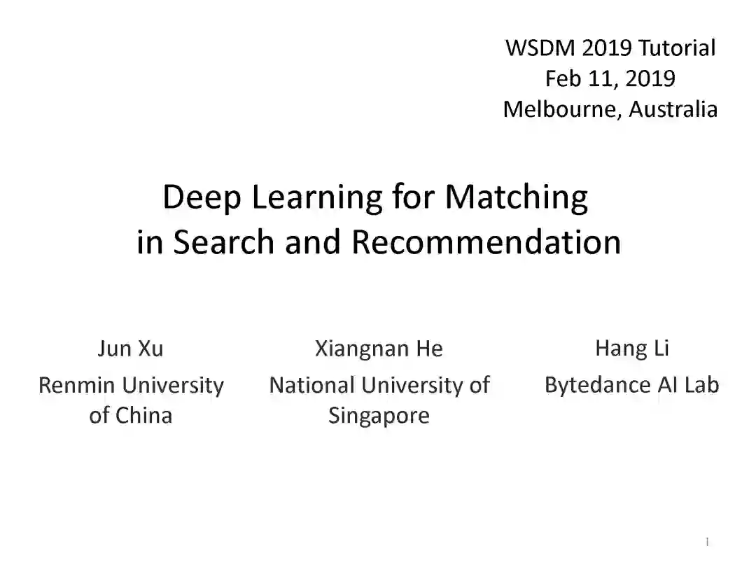 匹配是搜索和推荐中的关键问题。近年来,深度学习已经成功地应用到多种任务中,基于神经网络的匹配模型在实践中得到了广泛的应用,包括用于搜索的深度语义匹配模型和用于推荐的神经协同过滤模型。在本教程中,讲者将全面介绍基于深度学习的搜索和推荐匹配的最新进展。本教程的独特之处在于它提供了关于搜索和推荐的统一视图。通过将这两个任务统一在匹配的观点下,并对现有的技术进行比较回顾,会使听众对这一领域产生更深层次的理解和更多的见解。