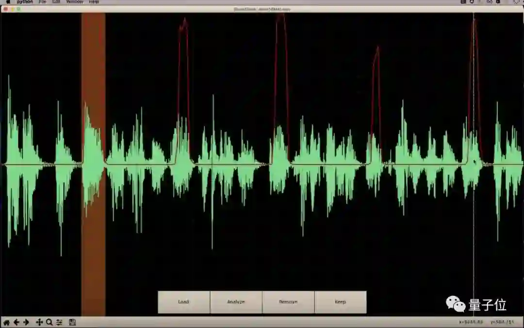 但有了SoundSeek的功能,只需要选中其中一个“呃”的波形,点击分析,AI就会帮你找出全部的“呃” (下图红色波峰) 。再来一键移除: