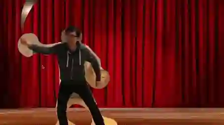 比如,只用右手腕上那一个点,就可以把幕布切开,进入下一个场景: