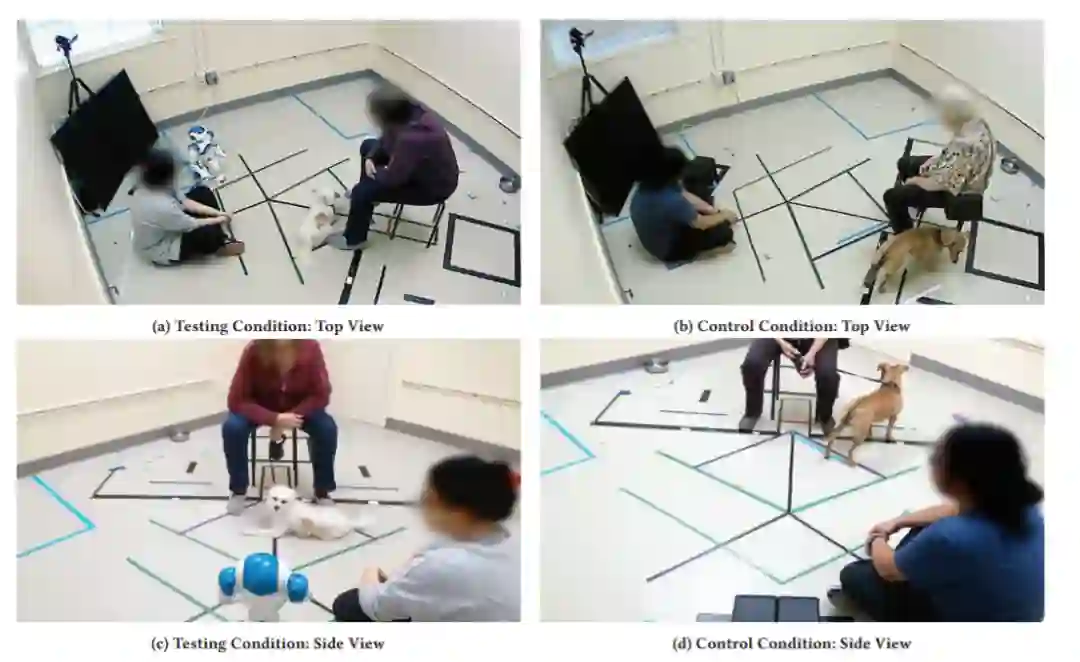 第 1 阶段:适应,狗主人和狗一起被实验人员带到房间,机器人和狗主人在测试条件下互相问候,消除狗的紧张心理。