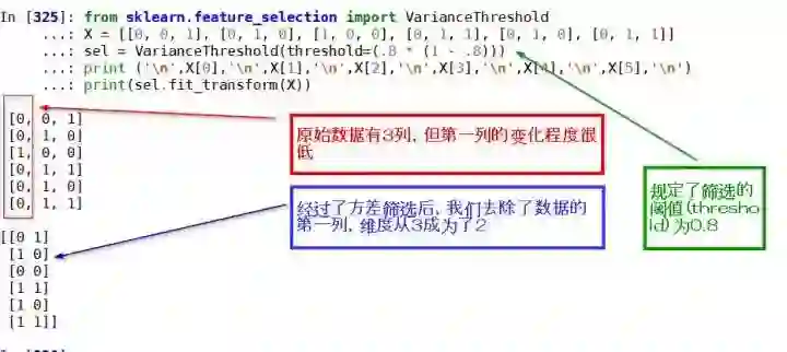 如上图所示,此处所调用的 Sklearn 的 API 还有一个作用就是自动移除单一取值的数据,一举两得。