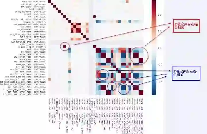 计算变量之间的相关性可以得到一个矩阵,用于描述每两个变量这件的相关性 (-1 代表负相关,0 代表无关,1 代表正相关)。在可视化后 KDD99 数据的相关性图谱后可得到下图。
