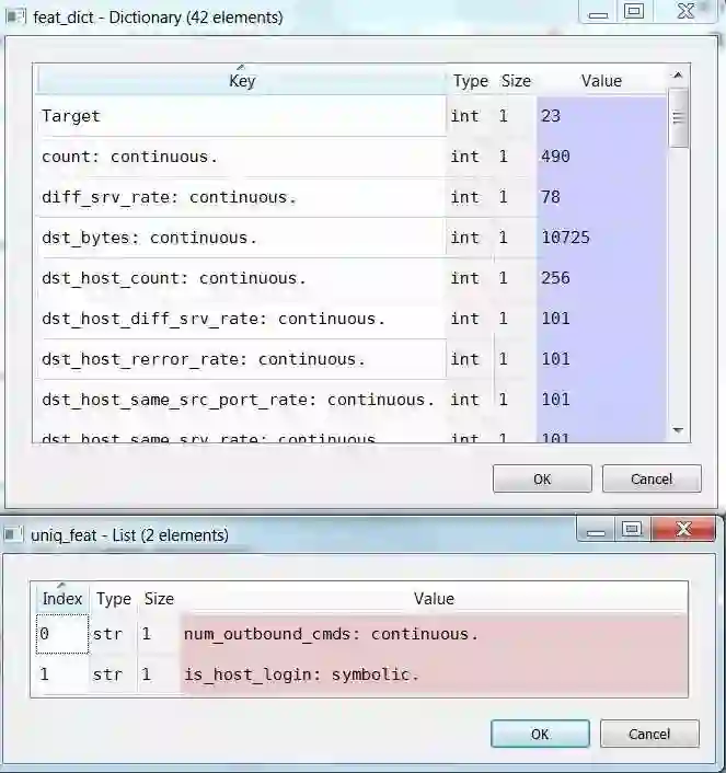 如下图所示,在除了预测值 (Target) 以外的 41 个值中,有两个变量 num_outbound_cmds 和 is_host_login 在整个数据集中取值唯一,应该被移除。于是我们成功的去掉了两个无用变量,此时也就不用思考这两个变量对于整体取值范围的影响。