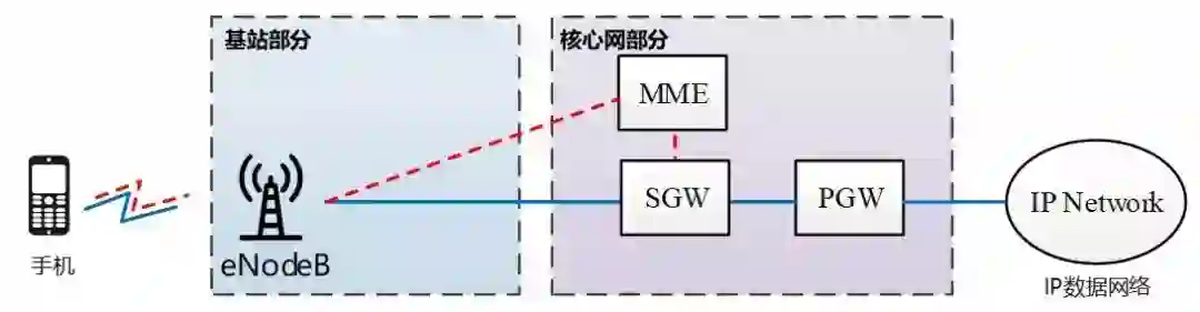 (注意,基站里面的RNC没有了,为了实现扁平化,功能一部分给了核心网,一部分给了eNodeB)