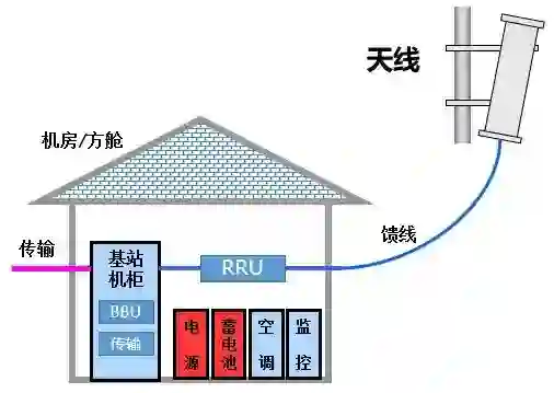 一个基站,通常包括BBU(主要负责信号调制)、RRU(主要负责射频处理),馈线(连接RRU和天线),天线(主要负责线缆上导行波和空气中空间波之间的转换)。