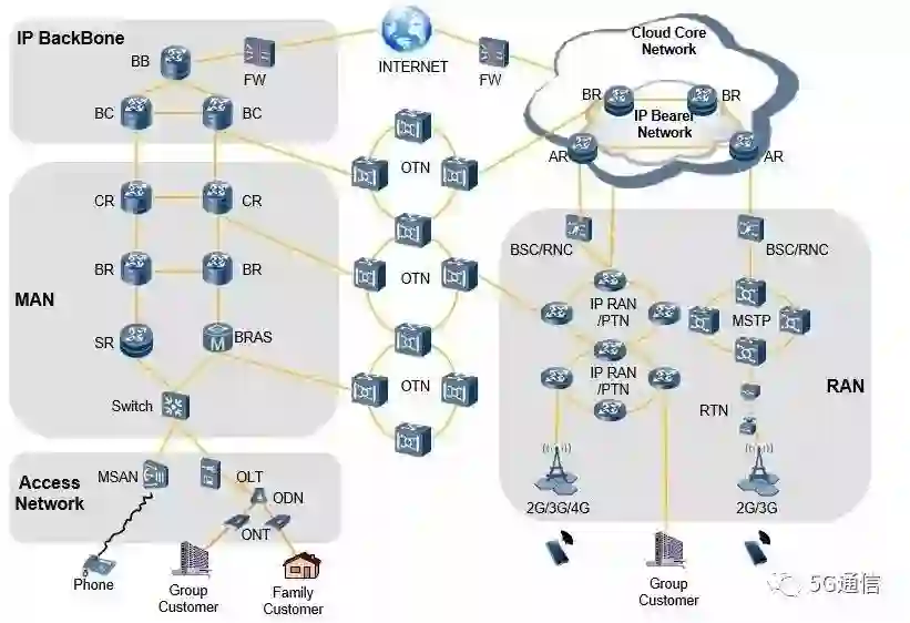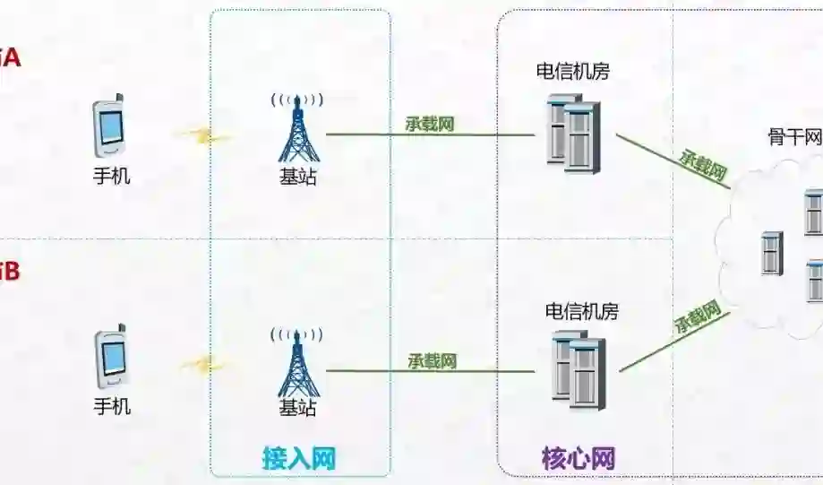 虽然我们从1G开始,历经2G、3G,一路走到4G,号称是技术飞速演进,但整个通信网络的逻辑架构,一直都是:手机→接入网→承载网→核心网→承载网→接入网→手机。