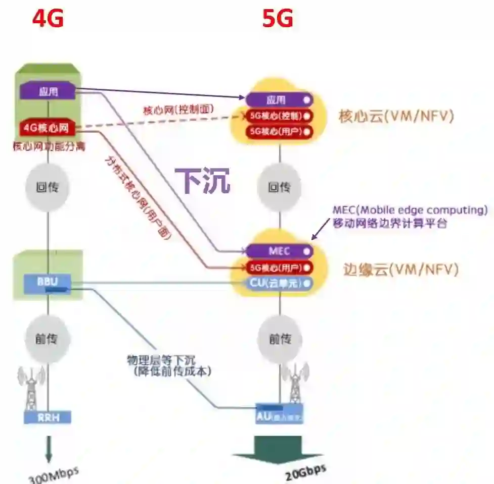 注意,在图中,EPC(就是4G核心网)被分为New Core(5GC,5G核心网)和MEC(移动网络边界计算平台)两部分。MEC移动到和CU一起,就是所谓的“下沉”(离基站更近)。