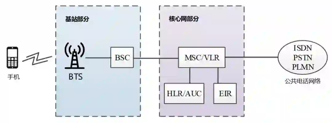 可以看出来,组网非常简单,MSC就是核心网的最主要设备。HLR、EIR和用户身份有关,用于鉴权。