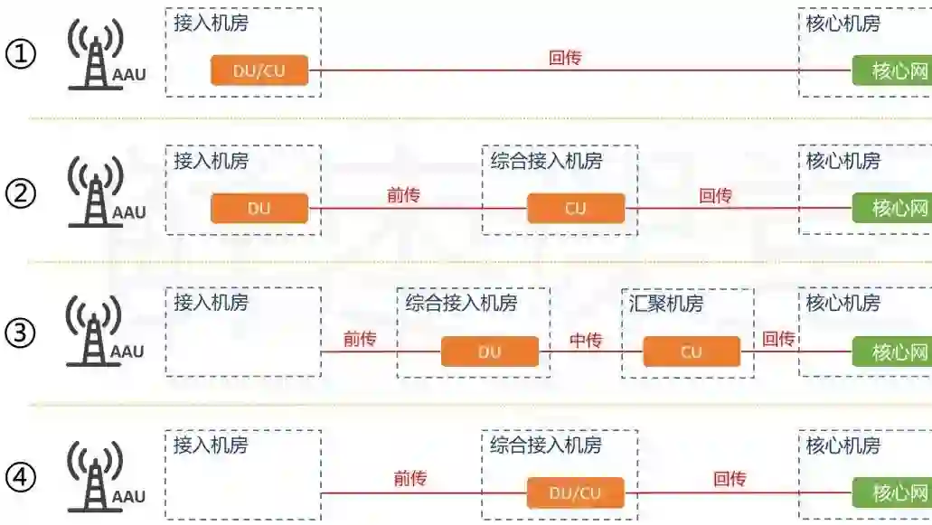 ① 与传统4G宏站一致,CU与DU共硬件部署,构成BBU单元。