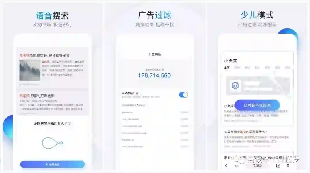 它支持文字搜索,语音搜索,图像搜索。同时还能过滤广告,页面加载更快速。