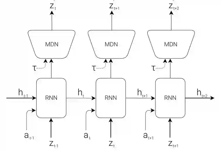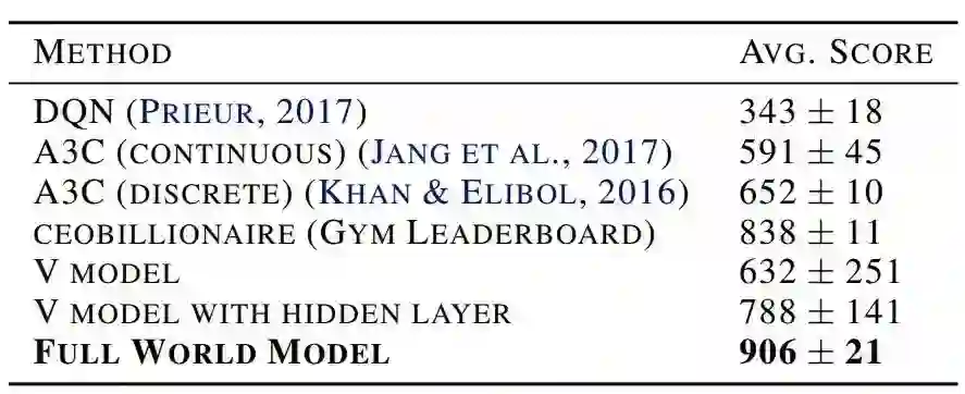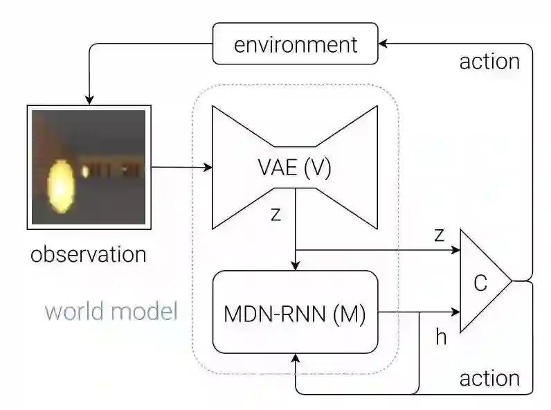 我们提出一种由人类认知系统启发而来的简单模型。在该模型中,我们的智能体有一个视觉感知模块,可以把所见压缩进一个小的表征性代码。它同样有一个记忆模块,可以根据历史信息对未来代码做预测。最后,智能体还有一个决策模块,只基于由其视觉和记忆组件创建的表征来制定行动。