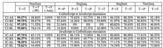 表 1:在 CoffeeScript 和 JavaScript 之间进行翻译的程序准确率。token 准确率见附录 C。
