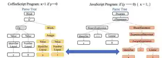 凭直觉看,程序翻译问题在其形式上类似于自然语言翻译问题。先前的一些工作提出将基于短语的统计机器翻译(SMT)用于代码迁移 [26,20,27]。最近,基于序列到序列(Seq2Seq)的模型等神经网络方法在机器翻译方面取得了当前最佳性能 [5,10,14,15,36]。在本文中,作者研究了使用神经机器翻译方法来处理程序翻译问题。然而,使基于序列到序列的模型失效的一个巨大挑战是:与自然语言不同,编程语言有严格的语法,它不能容忍拼写错误和语法错误。已经证明,当编程语言序列变得太长时 [21],基于 RNN 的序列生成器很难生成句法正确的程序。