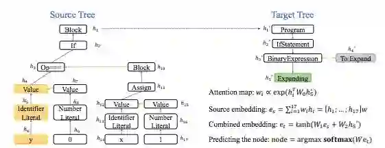 受到这个观测结果的启发,我们假设可以利用源解析树和目标解析树的结构信息来实现这种分离。受这种直觉的启发,我们提出树到树的神经网络,将树编码器和树解码器结合在一起。特别地,我们注意到在程序翻译问题中,源程序和目标程序都有各自的解析树。此外,跨语言的编译器通常遵循一个模块化过程,将源树中的各个子组件转换为相应的目标组件,然后使用它们组合成最终的目标树。因此,我们设计了一种树到树神经网络的工作流程来配合这个过程:当解码器展开一个非叶子节点时,它会使用注意力机制在源树中定位对应的子树,并利用子树的信息来引导非叶子节点展开。特别需要注意的是,树编码器在这种情况下有很大的作用,因为它可以将子树的所有信息聚合到它的根的嵌入中,这样嵌入就可以用来指导目标树的非叶子节点扩展。