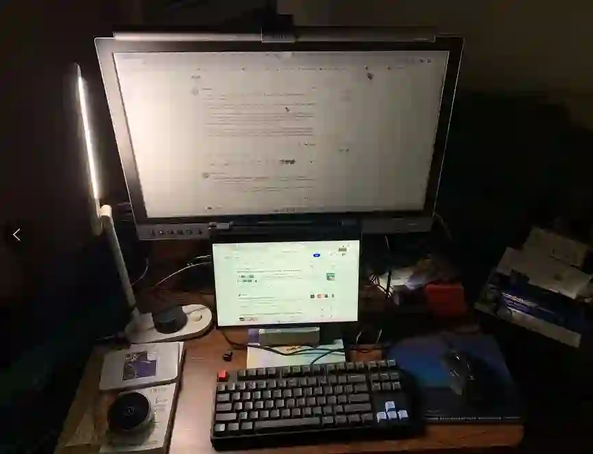 可以看到墨水屏被照亮了很多...另外桌面也照亮了,台灯关了也无所谓,只有挂灯,看书没有任何问题。这个灯是明基的Screenbar Halo,话说都配这么贵的墨水屏显示器了,不差一个挂灯了,之前用的小米的,感觉亮度有点不够,索性就配了个比较好的挂灯了。相比小米肯定高级很多哈,亮度提升了不少,最高亮度需要大电流的输出才行(1A有点勉强,1.5A-2A差不多),之前的小米就不用(因为没有那么亮),我挂了个充电宝就没任何问题了。