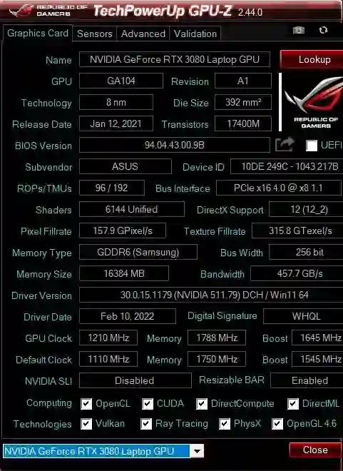 毕竟搞AI的,当然对GPU比较敏感,这个3050TI是基于GA107核心,有2560个CUDA Core,80个Tensor Core,基本是够玩了。计算能力8.6,目前(这句话写的时候还是最新,但是立马老黄3月份推出了H100)最新的特性该有的都有: