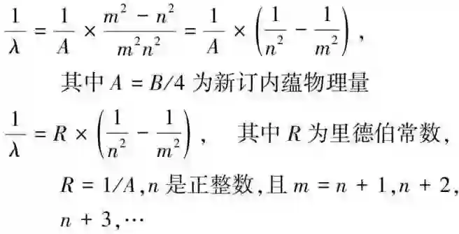 接下来就是证明这个推广后的巴耳末经验通式与里德伯公式是否等价,当然对象局限于氢原子。首先要进行波长换成波数的表示式,只要将推广后的巴耳末经验通式之分子项与分母项上下对调,就能转成里德伯公式,显然这就构成了它们之间的等价证明,这里用最后修正的巴耳末基数来计算出R=1/A=1/911.4=10972130.79m-1,这个数字接近里德伯当年所提的常数值10970000m-1[7]。推广后的巴耳末经验通式与里德伯公式的等价证明推演,十分简单,但限于氢原子所有光谱系,只要进行求波长倒数换成波数的表示式,过程详如下列形式转换: