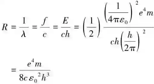先取氢原子光谱之波数1523310, 2056410, 2303240, 2437290, 2518130,接着将每一项波数皆除以第一项红光波数,取得各波数比为1, 27/20, 189/125, 8/5, 81/49,注意前述各项分母变化可转为1, 4×5, 25×5, 1×[5], 7×7然后再想办法变成如1, 4, 25, [36], 49这种有规律的数列,重点观察前面两组数列中第四项分母中括号数字,该项分母要同时消掉5又要变成36的话,就得将波数比数列通通都要乘上这个比例密码:5/36,其中,只需用第一项红光波数就能直接算得里德伯常数为:R=1,523,310/(5/36)=10,967,832,然后将红光波数转成里德伯常数与比例密码的乘积再带回到波数比,若将原波数比的分母换成只有里德伯常数的话,则比例密码要挪到等号另一边,也就是将各波数比乘上此密码得到下列数列: