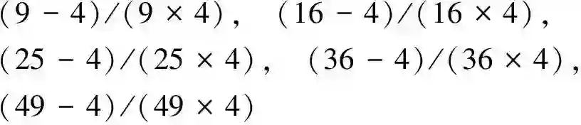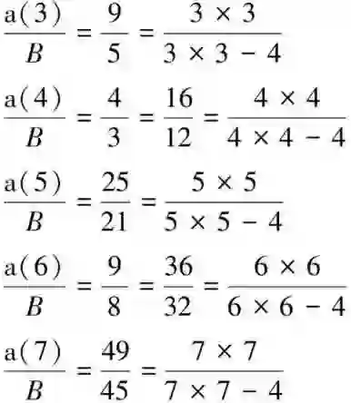 初看起来,这5项整数比像似无法构成规律性的分数数列,但如果将第二项和第四项之分子与分母分别乘以4,接着进行建立平方项推演,则分子部分依序可书写成3×3,4×4,5×5,6×6,7×7,而分母部分相应书写成完全平方再減4,这样就出现了依序渐增平方的变化规律。重新整理新得到的符号整数比恒等式如下列所示:
