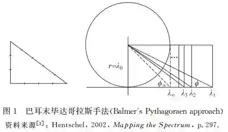 仔细观察上式等号右边的平方比例项形式,与巴耳末公式右边整数平方比例项形式是一模一样,上述公式就是毕达哥拉斯定理的应用,也就是我们较熟悉的勾股定理。由于巴耳末公式当n→∞ 时,λ→B,为这个线系的极限﹐这时邻近二谱线的波长差就趋于零,因而在归纳光谱数据分析手法时,应可将一维问题二维化,于是化学光谱分析专书[3]中采用几何方式,介绍巴耳末光谱分析手法,从几何关系找到谱线波长之间遵循毕达哥拉斯定理(即勾股定理),经过反复试算,可概念性地找到一个共同因子,就是巴耳末基数,这种以形求数概念就如同下列图1所示。